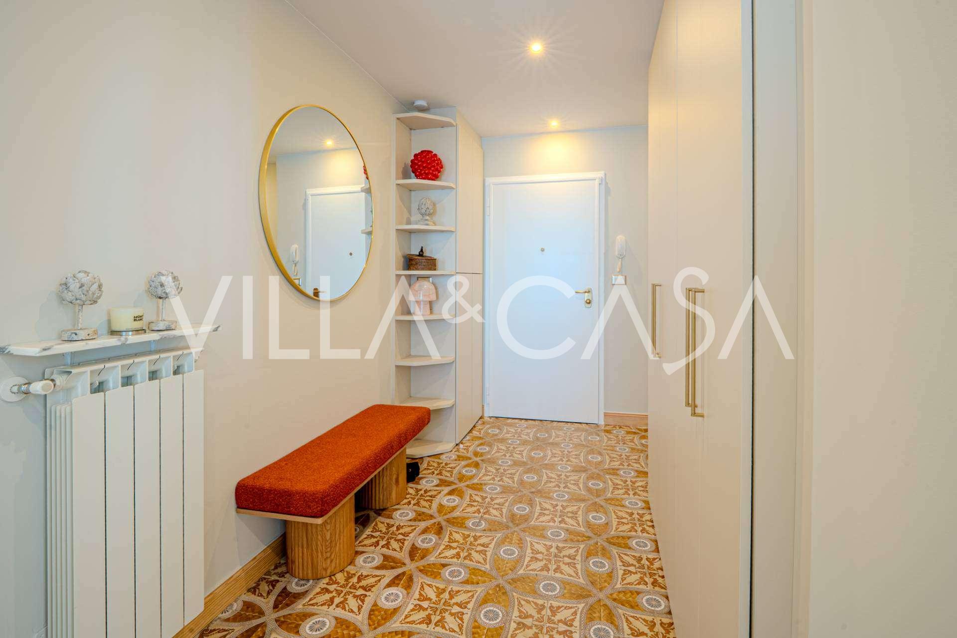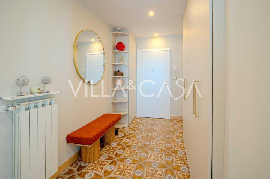 A lakás belső kialakítása a modern kényelmet az elegáns otthonosság hangulatával ötvözi. A tágas előcsarnok egy pompás nappaliba vezet, amelyhez nyitott konyha tartozik, és ahonnan lenyűgöző kilátás nyílik a tengerre. A nappaliból két erkélyre is ki lehet lépni, ahol élvezheti a tengeri szellőt és a Ligur-part látványát.