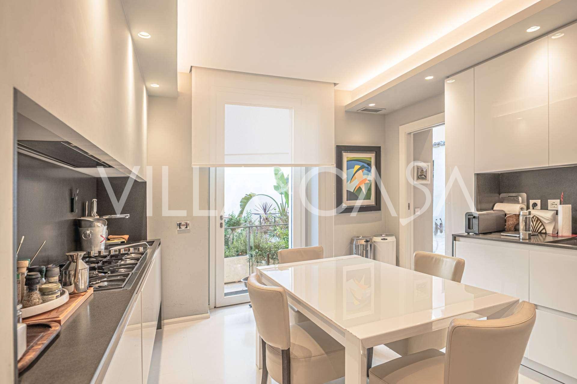 Az első emeleten egy digitális páncélajtó vezet a nyitott típusú, kifinomult nappaliba, amely ideális vendégek fogadására. A modern, teljesen felszerelt konyha összeköttetésben áll a formális étkezővel, amely egy bájos privát belső kertre nyílik: a nyugalom és a magánélet oázisa, amely tökéletes pihenésre vagy exkluzív események megrendezésére. Egy elegáns vendégfürdőszoba egészíti ki ezt a szintet.