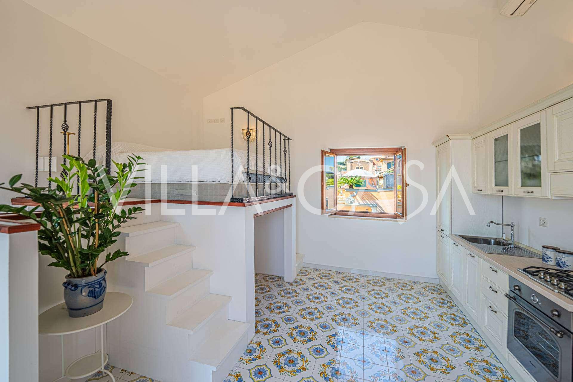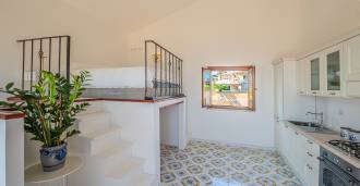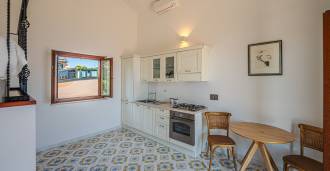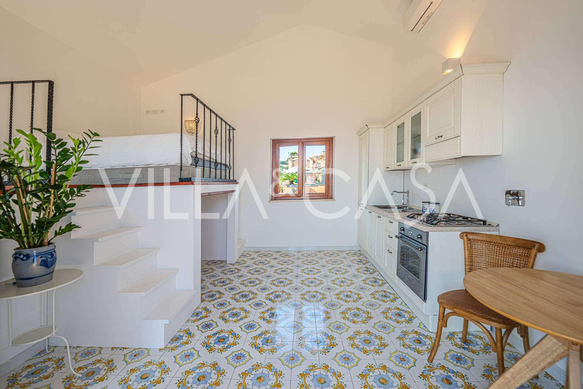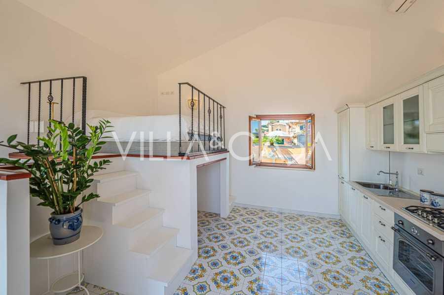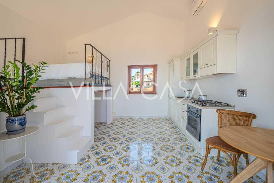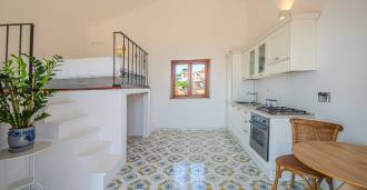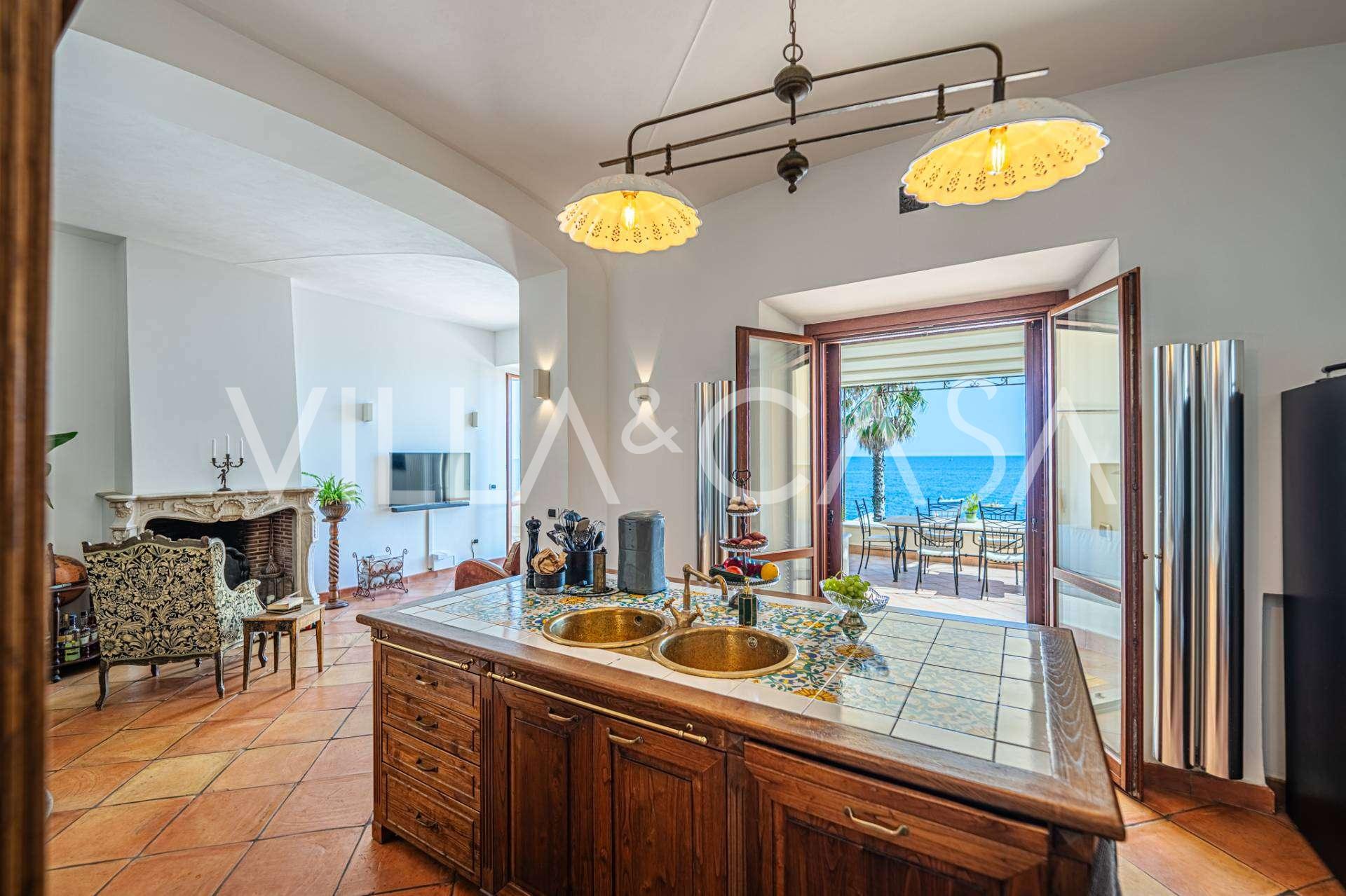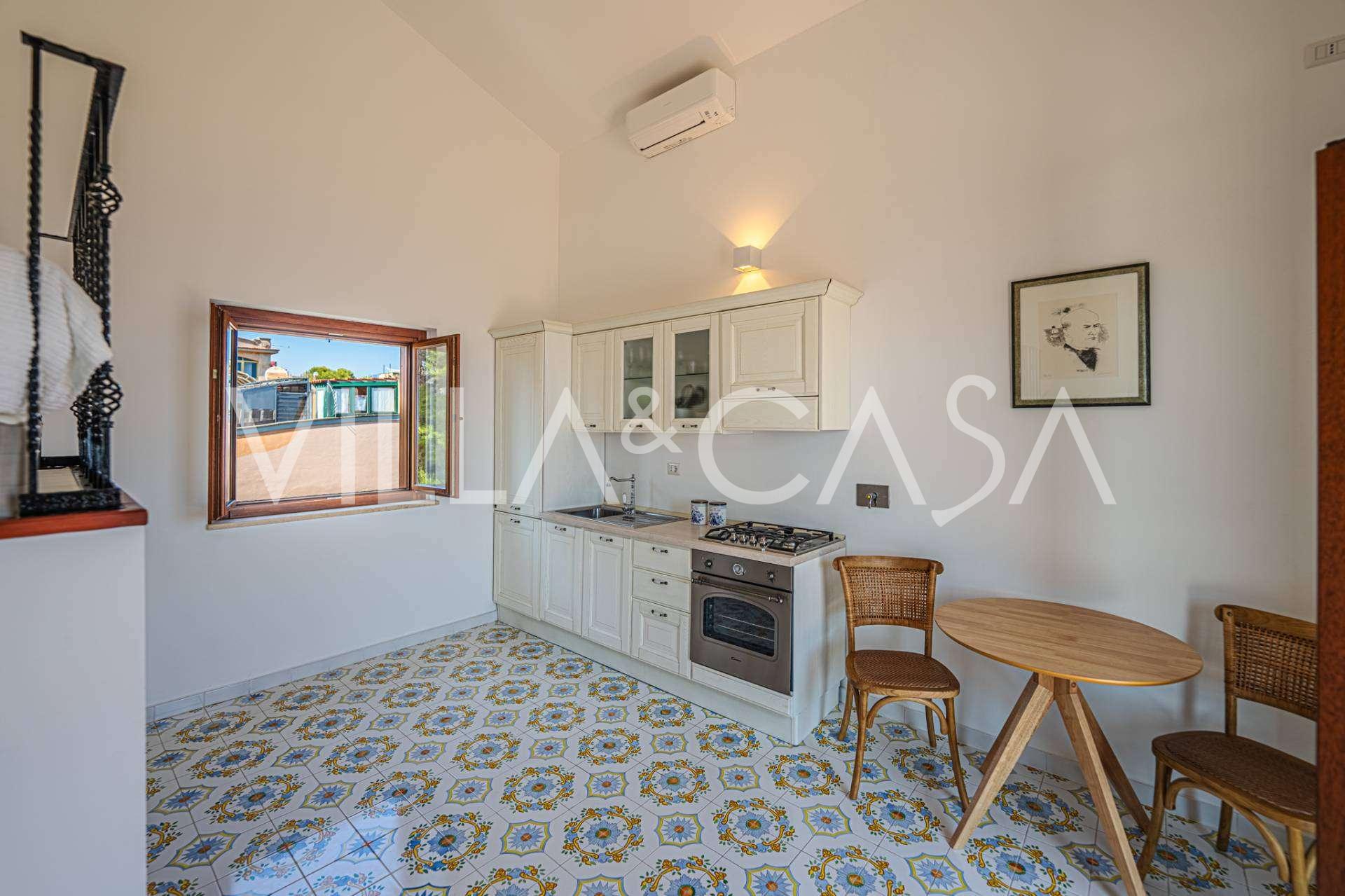 A fő nappali, amelyet nagy ablakok díszítenek, egy teraszra nyílik, amely ideális a társalgásra és a ritka naplementék élvezetére. A kézzel készített, egyedi tervezésű konyha ötvözi az esztétikát és a funkcionalitást, Positano-i csempével díszített szigettel és eredeti réz mosogatókkal.