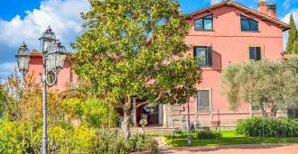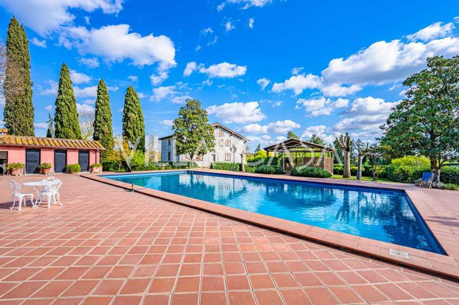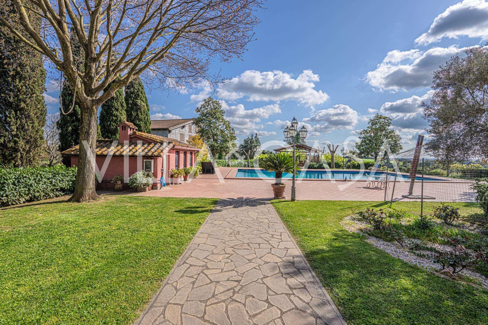 A római körgyűrűn kívüli magaslaton, a népszerű Via Cassia úton, egy lenyűgöző, több mint két hektáros zöld parkkal körülvéve található ez a csodálatos birtok medencével, amely ötvözi a kifinomult luxust és a természet nyugalmát.