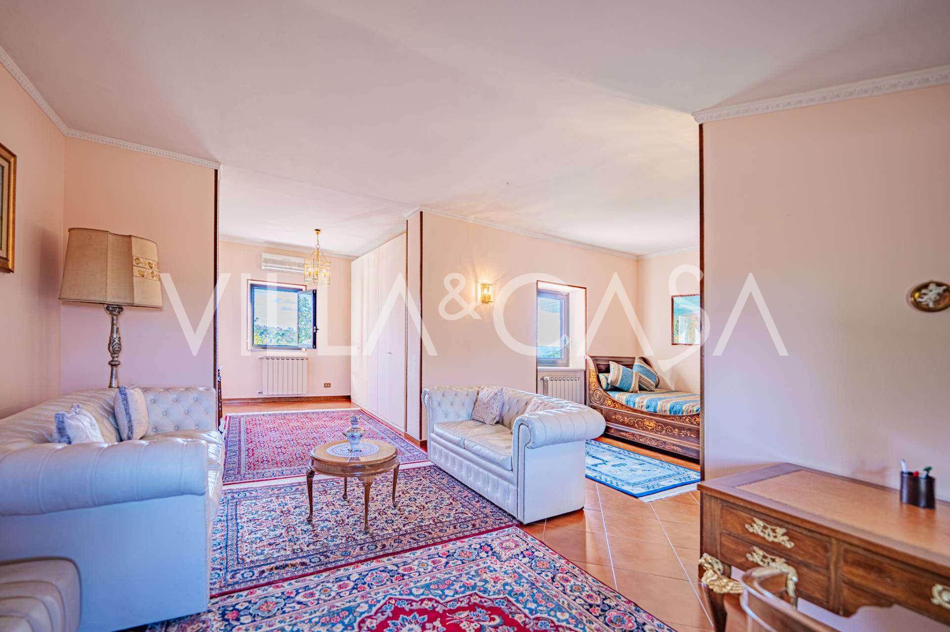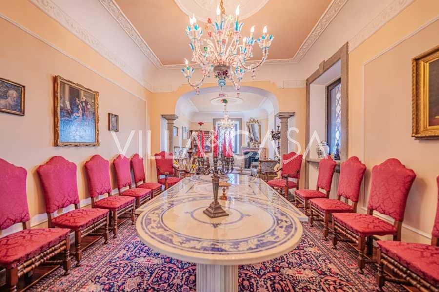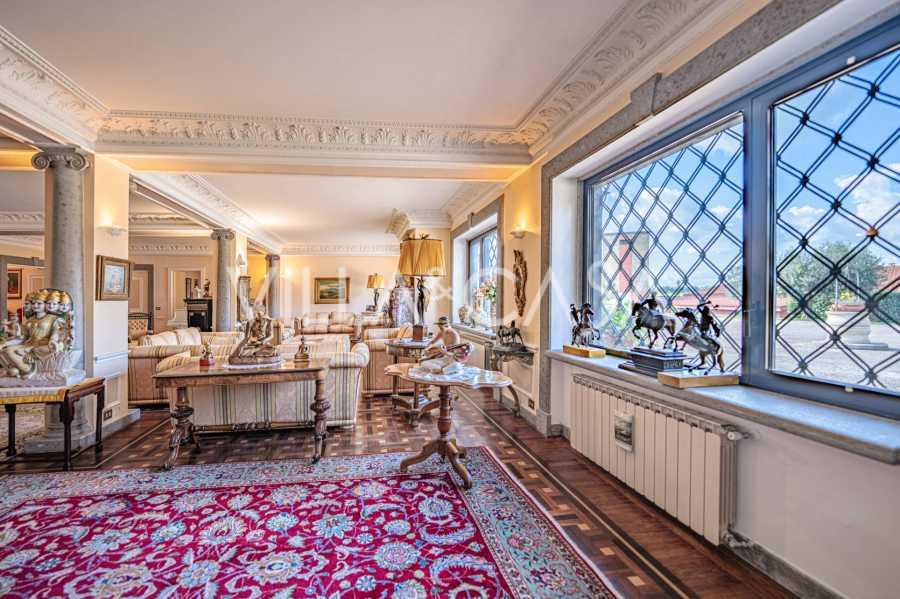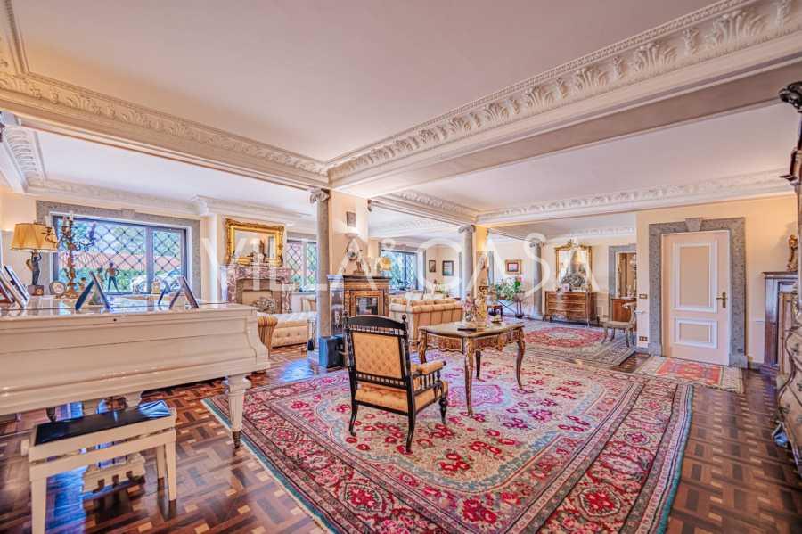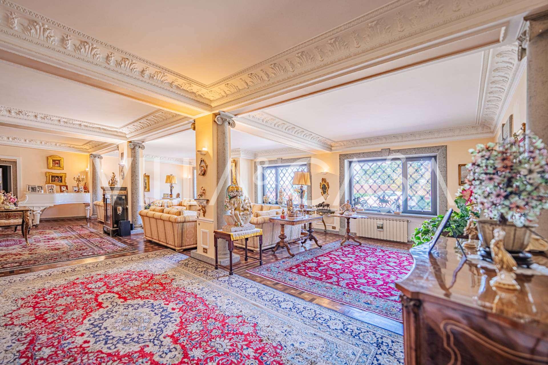 A villa belső terei lenyűgöznek csodálatos ízlésükkel és kifinomult eleganciájukkal, exkluzív részletekkel, értékes anyagokkal és arisztokratikus stílussal. A ház központja egy pompás nappali, amelyet egy nemes rózsaszín márványból készült antik kandalló díszít, és két világos dolgozószoba veszi körül elegáns történelmi kandallókkal, amelyek otthonos és kifinomult hangulatot teremtenek. A tágas ablakok lágy természetes fényt árasztanak, amely visszatükröződik a drága fából készült polírozott parkettán.