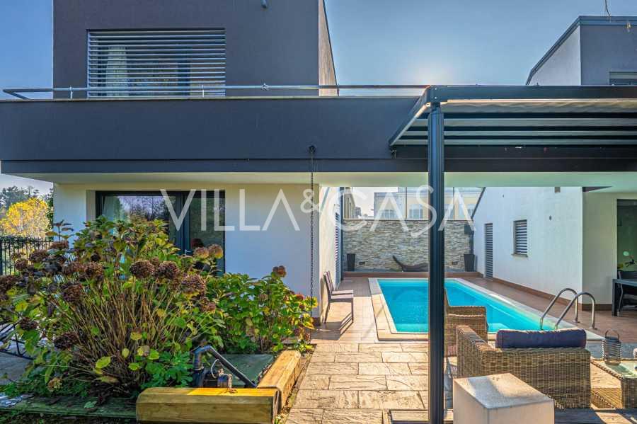 Ferrara szívében, gondozott zöldövezetben, eladásra kínálunk egy modern házat, amelyet 2014-ben építettek, és amelynek összterülete körülbelül 360 m². A ház két önálló részre van osztva: a főépületre és egy külön vendégházra. Ezeket a második emeleten egy tágas közös terasz köti össze, amely egységes térérzetet teremt, és gyönyörű kilátást nyújt a kertre és a pihenőövezetre.