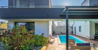 Első emelet: tágas és világos nappali, amely nagy fedett teraszra és kertbe nyílik, modern konyha új berendezésekkel, hangulatos grillezőhely, fő hálószoba saját fürdőszobával és gardróbbal, vendég fürdőszoba, finn szauna, második hálószoba saját fürdőszobával.
